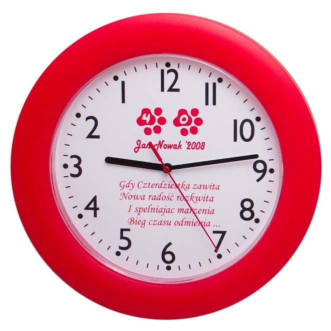 w odwrotnym kierunku. Na zdjęciu mamy zegar w kolorze czerwonym z tarczą