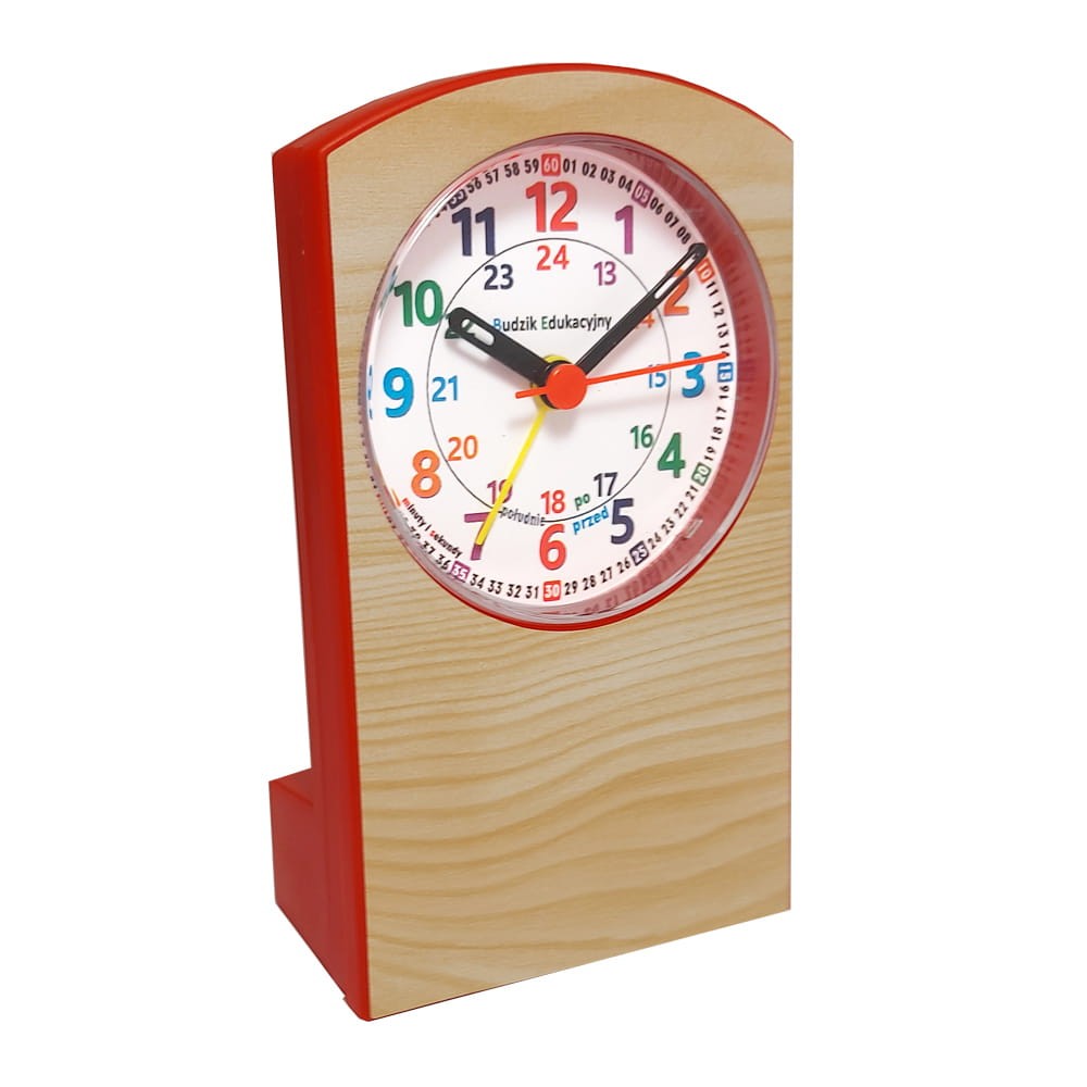 Polecamy kwarcowy budzik edukacyjny służący do nauki odczytu czasu.