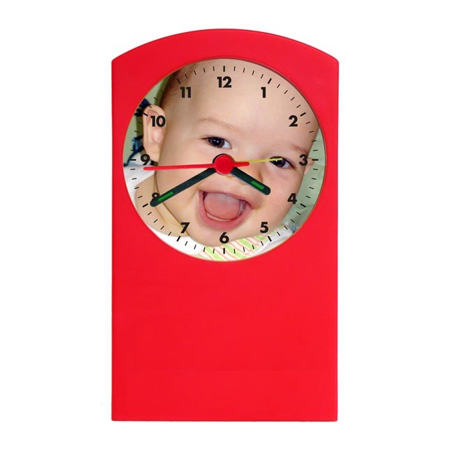 Jako przykładowe zdjęcie załączono budzik w kolorze czerwonym z tarczą