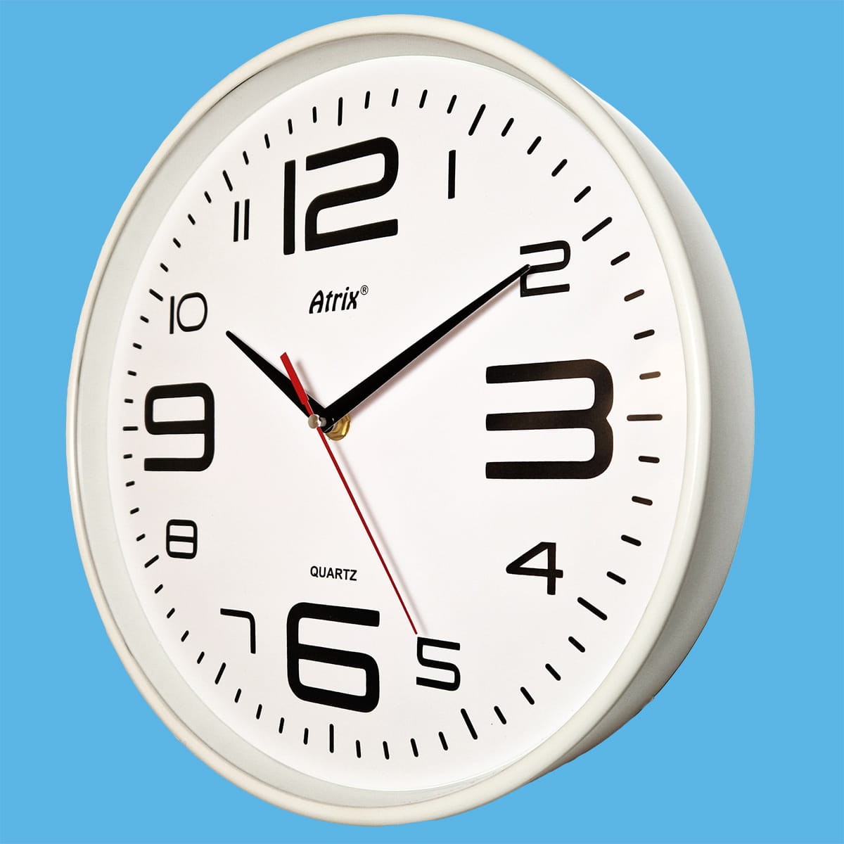 Biała tarcza z wyraźnymi cyframi arabskimi w kolorze czarnym.