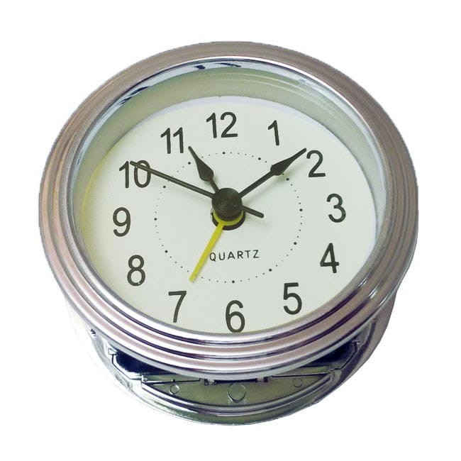 Kompletny wkład zegarowy o plastikowej obudowie w kolorze srebrnym.