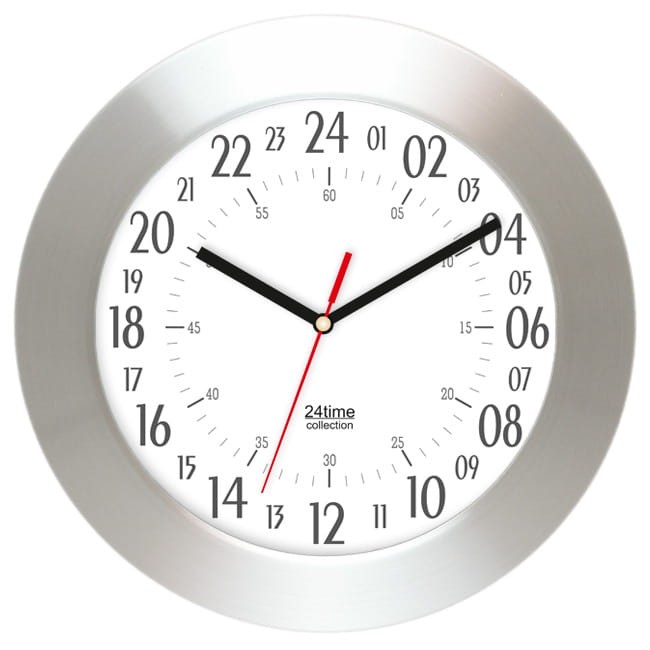 Polecamy 24 godzinny zegar ścienny z szeroką aluminiową ramką.