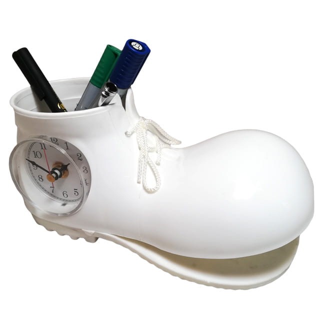 Oryginalny zegar w kształcie buta z oderwaną podeszwą.
