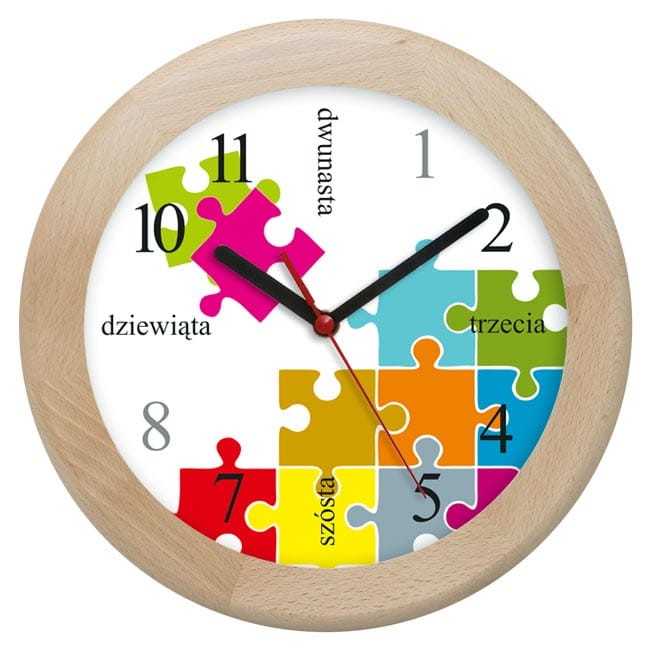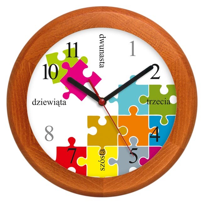 Polecamy kwarcowy drewniany zegar ścienny z tarczą z kolorowym puzzle.