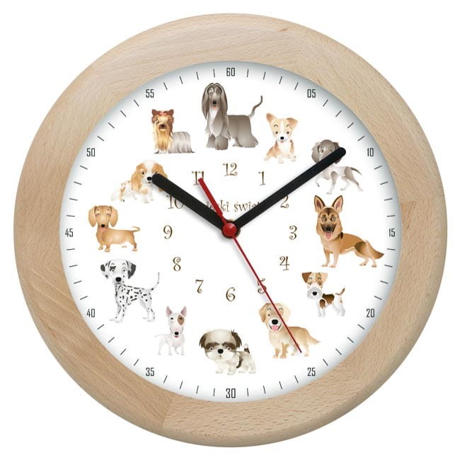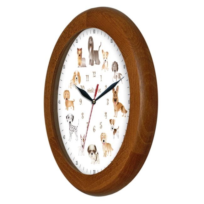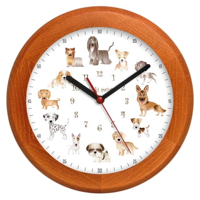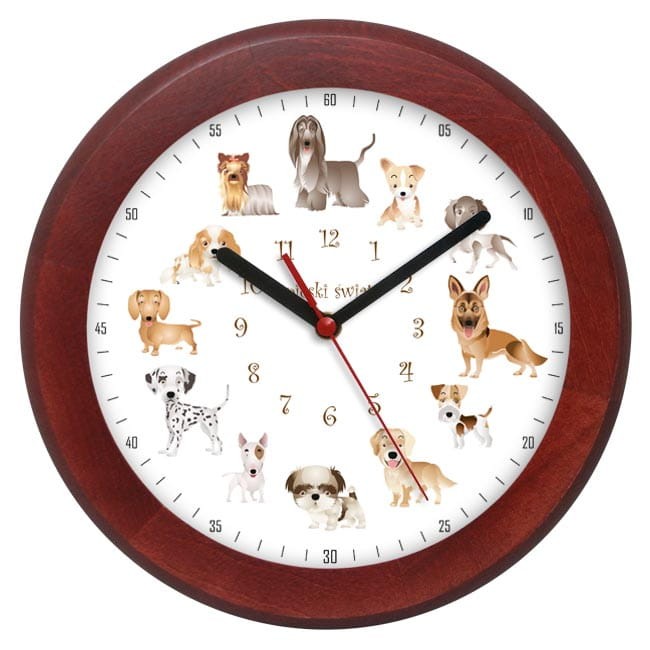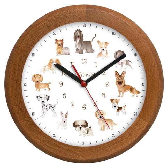 Polecamy zegar ścienny z tarczą przedstawiającą dwanaście rasowych piesków.