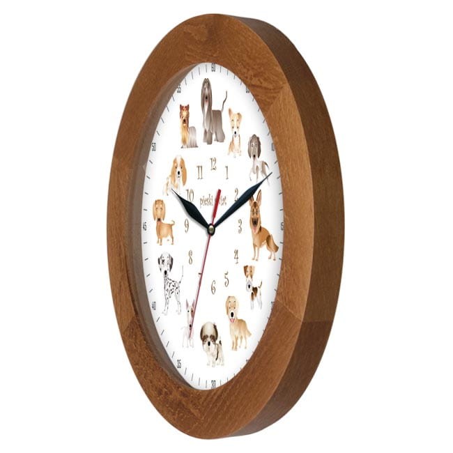 Polecamy drewniany zegar na ścianę z tarczą przedstawiającą dwanaście rasowych piesków.