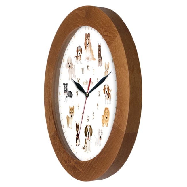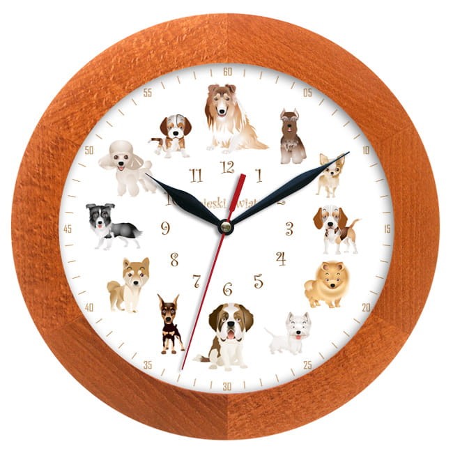 Polecamy zegar ścienny drewniany z tarczą przedstawiającą dwanaście rasowych piesków.