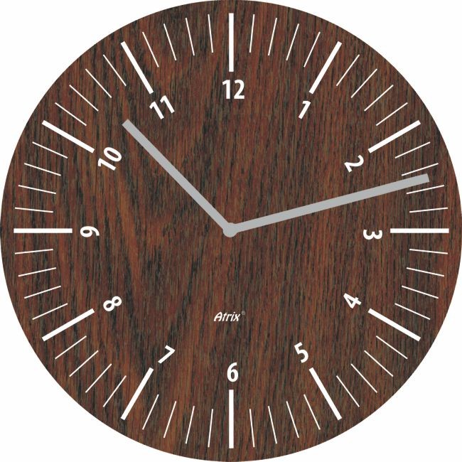 Drewnopodobna powierzchnia tarczy posiada godzinowe indeksy.