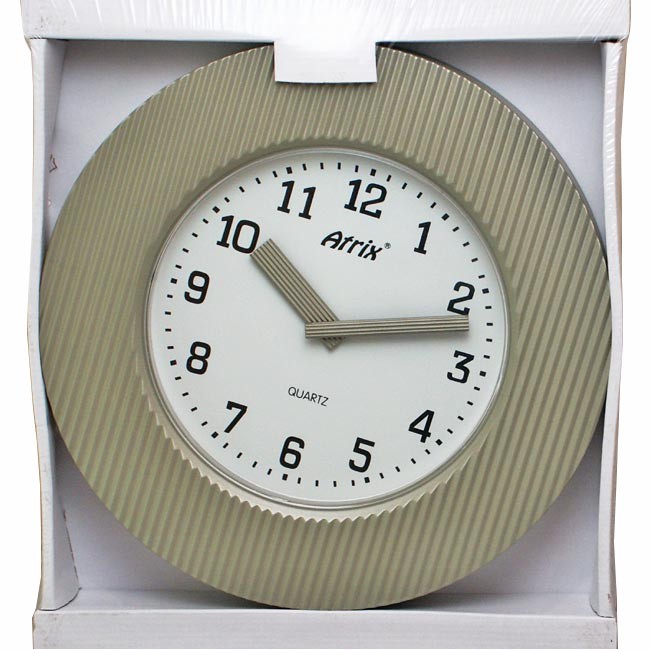 Zegar zapakowany w biały kartonik z okienkiem (zafoliowany).