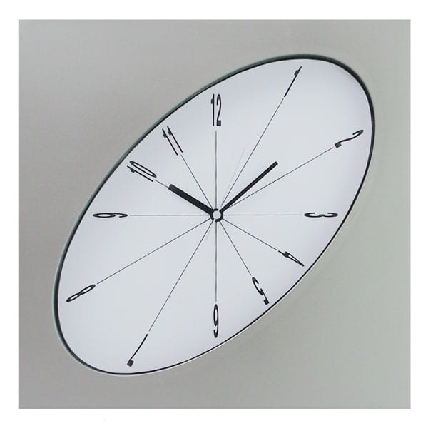 Polecamy kwadratowy oryginalny zegar naścienny z tarczą w kształcie elipsy.