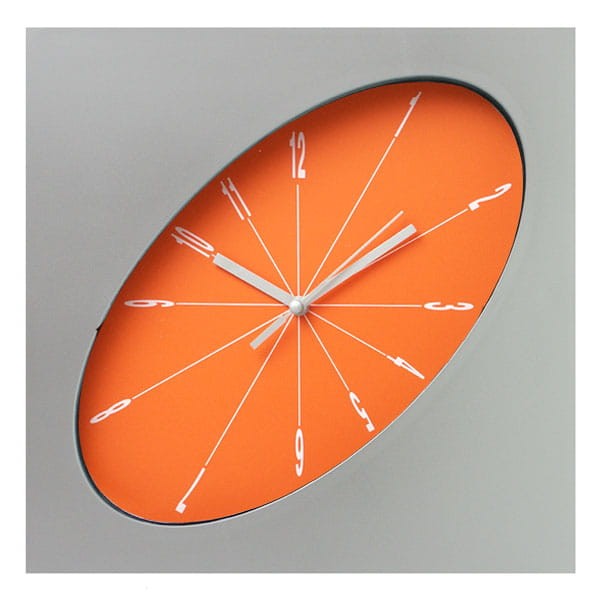 Polecamy oryginalny kwadratowy zegar na ścianę z tarczą w kształcie elipsy.