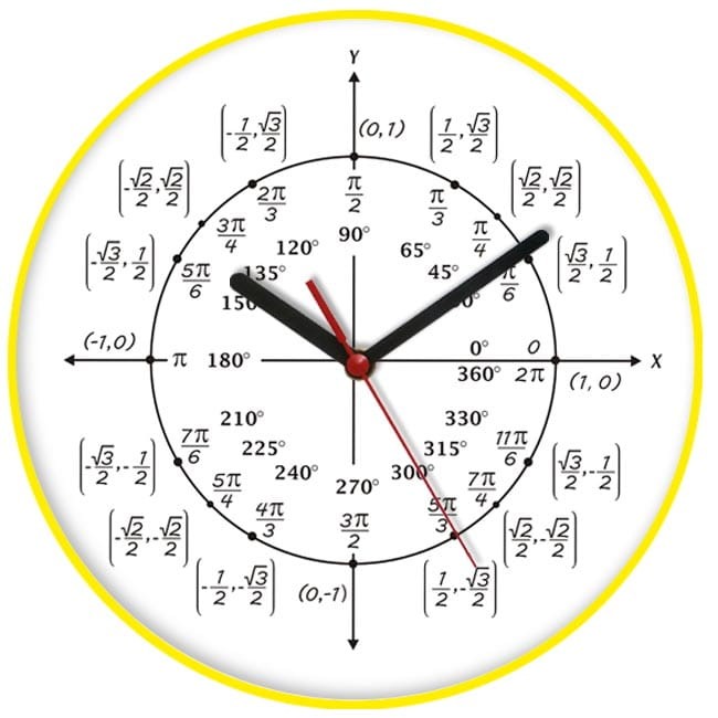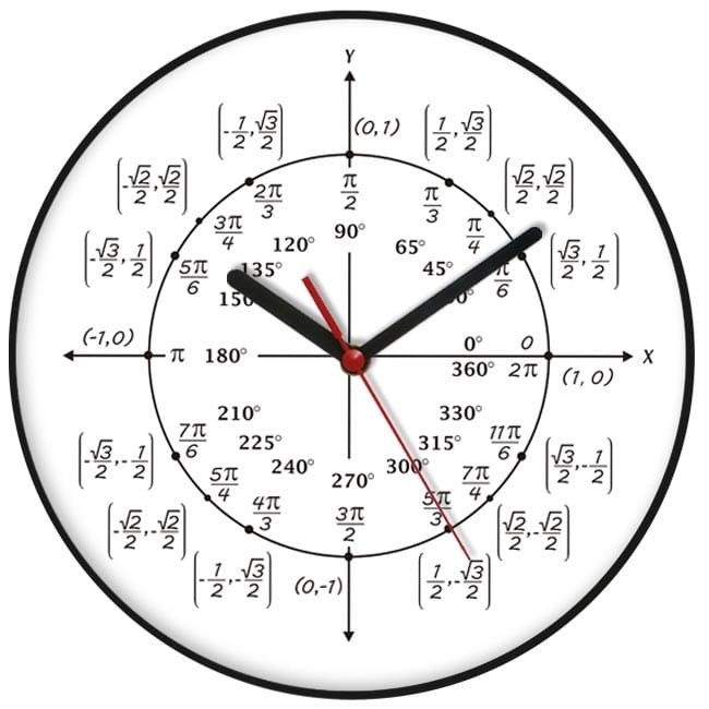 Zegar posiada tarczę z układem współrzędnych z opisem kątów okręgu.