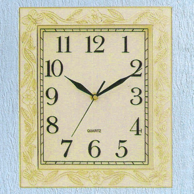 Plastikowa tarcza w kolorze kości słoniowej ze złotymi wypukłymi cyframi.