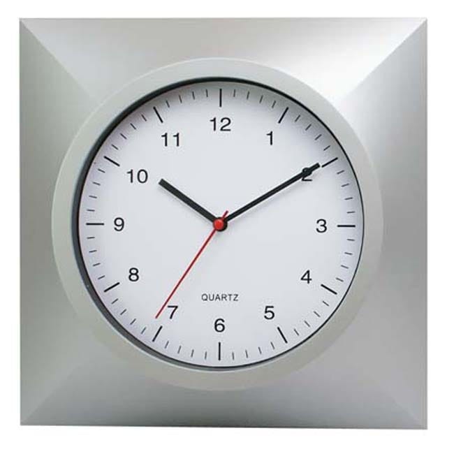 Kwadratowy plastikowy zegar z napylonym srebrnym kolorem obudowy.