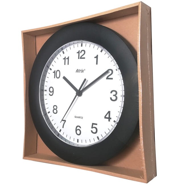 Plastikowy zegar z szeroką ramką w kolorze czarnym.