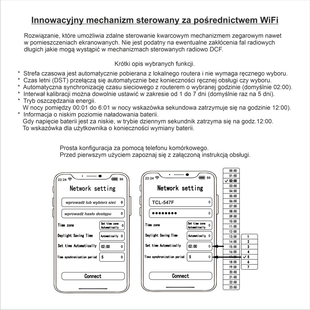 | mechanizmy | mechanizm kwarcowy cichy sterowany WiFi |